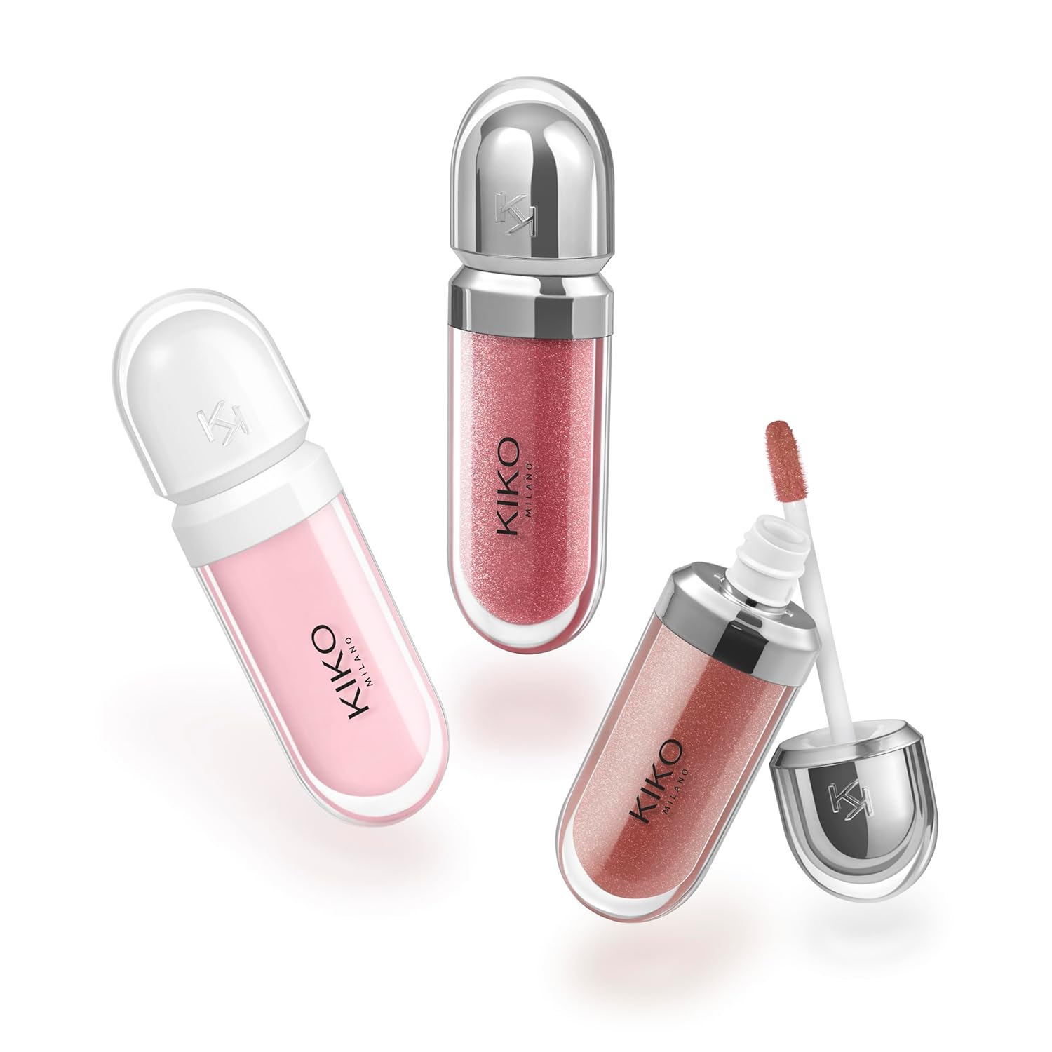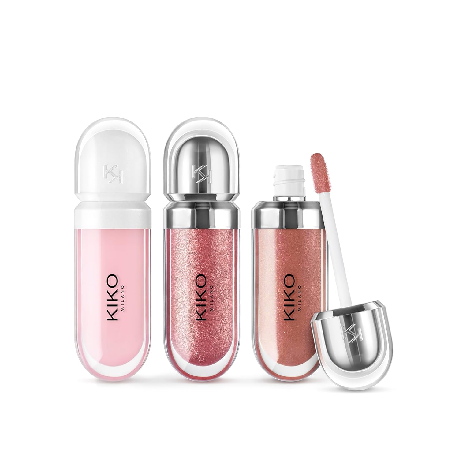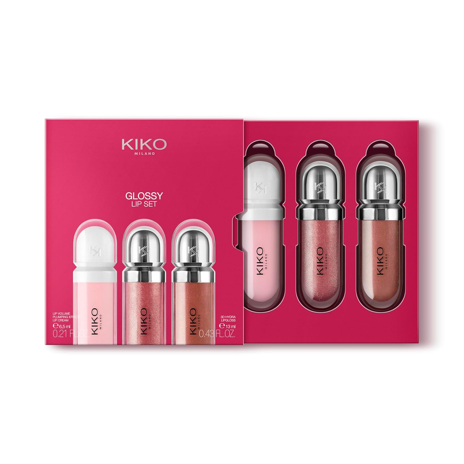 KIKO Milano Glossy Lip Set, Makeup Set: 2 Moisturising Lip Glosses and 1 Perfecting Lip Creamست لب کیکو میلانو شامل ۲ برقلب مرطوبکننده و ۱ کرم حجمدهنده است. این ست با آبرسانی عمقی و درخشش فوقالعاده، لبهایی نرم و برجسته به شما هدیه میدهد؛ انتخابی لوکس برای هدیه و آرایش حرفهای.